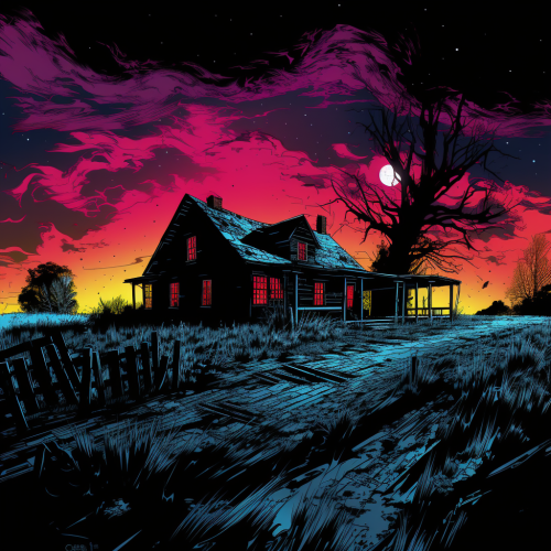 comic book panel strong black ink neon colors wide shot of old farmhouse in field