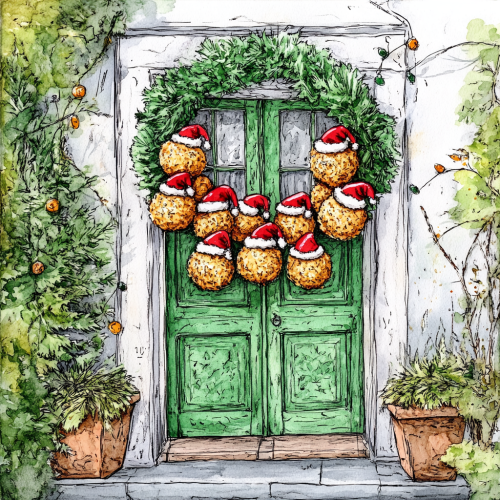 Style of Medieval Bold brush stroke acrylic painting , side view of black hood man holding a polka dot party hat looking the door,wooden door with demonic aura, X shaped wooden sign in front of the door --ar 2:1