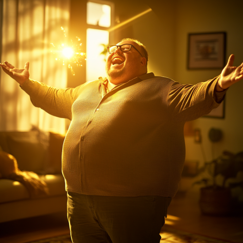 A vibrant advertisement image featuring an excited, man, age 52, slight gray hair in his living room with open arms toward the camera. slight Golden light, small glowing from the window not the whole image. Canon camera with an aperture of 5.2 . Light blue hues --s 500 --c 10 --v 6.0 --ar 9:16