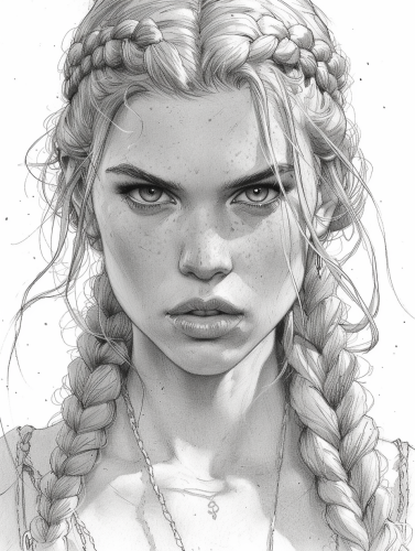 portrait of a rude and furious Lagertha from the front, with an epic and defiant look, hand-drawn comics, by Frank Cho --ar 3:4 --stylize 750 --v 6.0