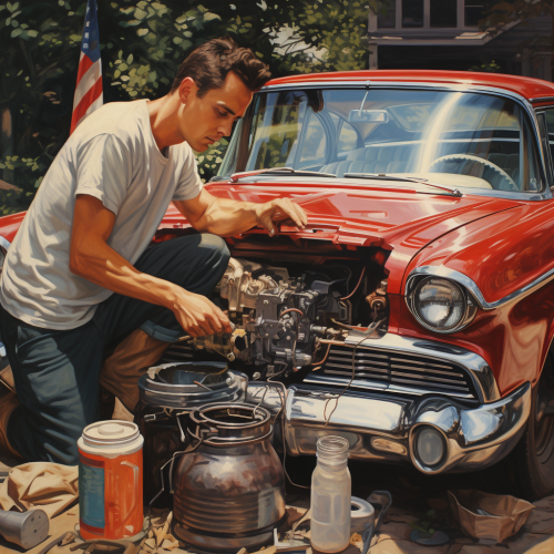 Vintage photograph of an office worker and a 1950s-style robot collaboratively reviewing a large, futuristic clipboard or control panel with dials, knobs, and flashing lights. The robot could hold a pen-like stylus while the human takes notes, creating an image of seamless collaboration. Vintage design elements like pastel colors, metallic finishes, and soft, glowing lights would enhance the scene’s retro-futuristic look. --ar 16:9 --upbeta --v 4