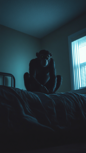 Low angle of a tall shadowy monkey demon sitting on the edge of a bed at night staring at the camera. From the point of view of someone laying in the bed. In the style of David Fincher. Dark, moody, atmospheric, cinematic. 35mm filmstock. --ar 9:16