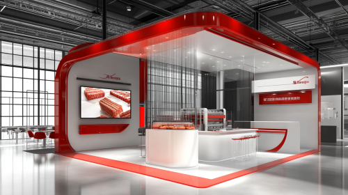 The design of the exhibition booth structure size 9*18 meter , 2 floor, emphasizing red and white to look luxurious and modern, showing the leader in innovative design of machinery for the food industry, with a large TV screen. --ar 16:9 --v 6.1