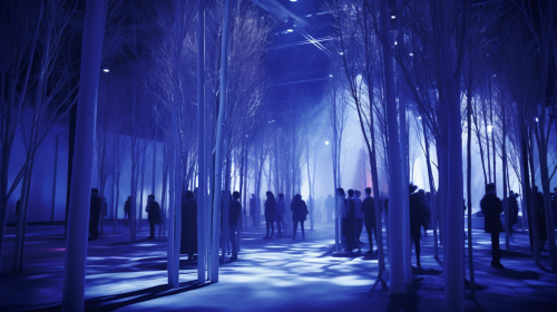 Exhibition trade show design, a dense grove of young tall and thin Aspin trees in a warehouse, hyper-realistic blue/purple lighting and atmosphere, Fujicolor, film grain, Fujifilm, award-winning, HD --ar 16:9 --v 5.2