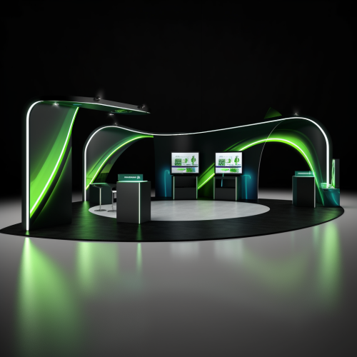 3 * 12 squired meter exhibition booth, colors neon green and black, 7 * 2 meter curved screen as a wall, Open from 3 sides, modern design, --v 5.2