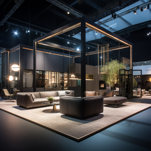 This is a furniture booth with a side length of 30 meters, a width of 12 meters, and a height of 5 meters. At the ISH exhibition, the exterior is composed of high-end steel frames, glass and curtains. The products on display are sofas, dining tables, chairs, strong warm light products, a minimalist cement reception desk, the background is the ceiling of the exhibition hall, made of ultra-high definition materials, and the external wall has a light gray corporate logo. Realistic contrast lighting style, uhd image, 8k