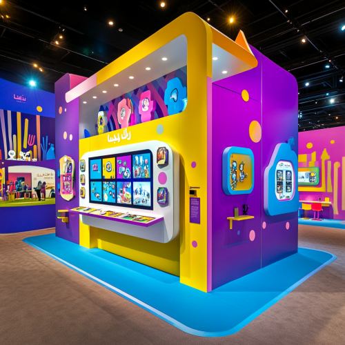 Exhibition booth with vibrant colors and Saudi people.
