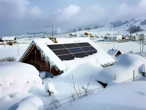This image captures a typical European rooftop covered in snow, with solar panels partially cleared, showing that they are still working despite the winter weather. The setting includes a snowy landscape and nearby houses, emphasizing the practicality of solar panels during the colder months. The panels are tilted to help snow slide off, highlighting proper installation for winter efficiency --ar 4:3 --s 50 --v 6.0