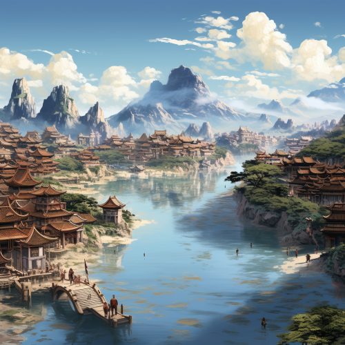 chinese fantasy d&d town with large river in the style of fantasy concept art