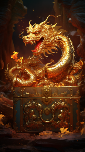 Golden chinese Dragon Red Blackgroud, river, kindly, richy, gold, Treasure box Full body, illustration --ar 9:16