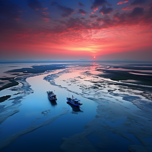 Shadowed on the river, China's maritime countryside is on both sides, with blue and red dusk, and a big river in the middle, strong sunrise