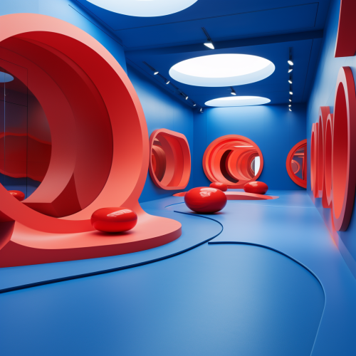 a room for an interactive exhibition. there are two rooms. One room is rectangular and larger. completely designed in blue colors and symmetrical shapes. the surfaces are smooth. The second room is in the middle of the other room. it is round and designed in red, soft and organic shapes. the exhibition should be abstract. --v 5.2 --style raw