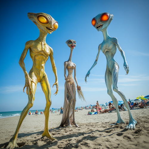 different types of tall beautiful male and female adult extraterrestrials or aliens having fun on a beach, reprilian, lyran, sirian, exotic, extraterristials but no humans, hyper realistic, --no humans