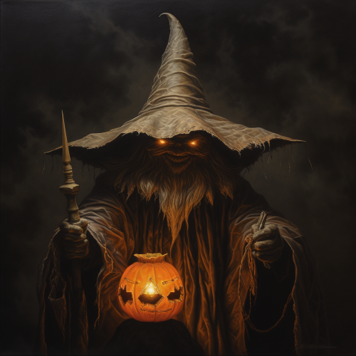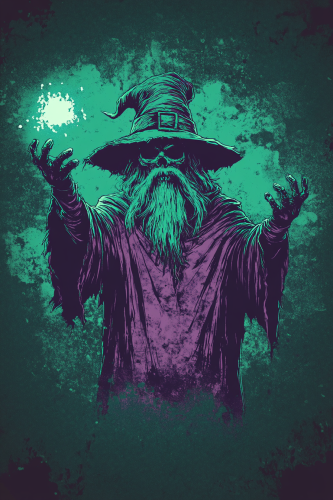 Dead Wizard, doom illustration, t-shirt graphic, centered on a plain background, glow, old, dirty, worn, surreal, block colours, block print style, lino print style --ar 2:3