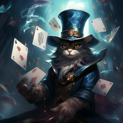 cat coming out of a wizard's hat, throwing cards, league of legends artstyle