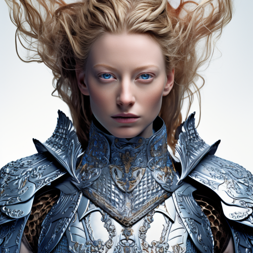 stepping forward, studio photo Tildo swinton as an Exotic female wizard looking straight into camera with determination and anger, intricate, blue metal armor, eastern style influence, asian details, maximalism, armor dynamic pose, action, plain white background, studio lighting ::1 Background ::-0.5 --style raw --v 5.2 --s 250