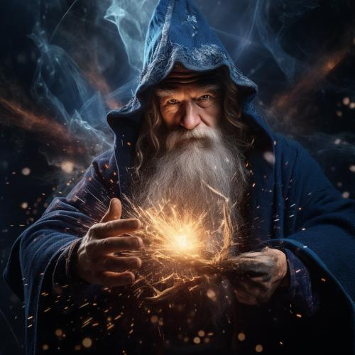 ****photorealistic, cinematic, friendly old wizard with hat and long midnight blue blue robes , doing magic with blue sparks everywhere