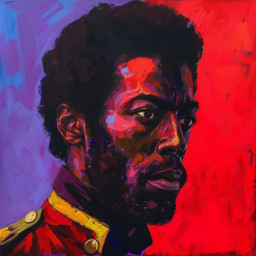 a three quarter view portrait of a heroic black male, in the style of Bob Peak and Robert McGinnis, bold colors