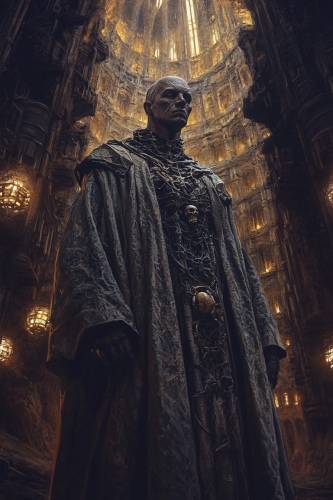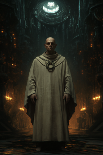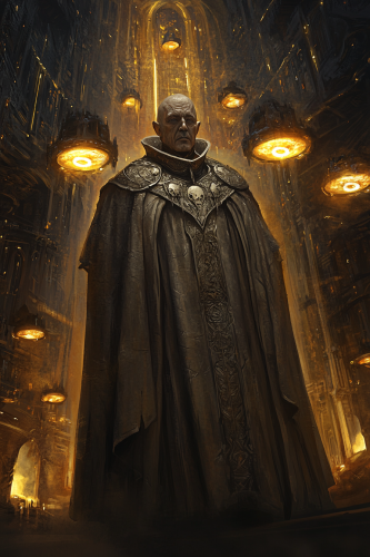 a full body shot of a male grimdark priest. He wears a grimdark gothic robe. His face is visible. In the background is an underground dark grimdark gothic cathedral in a hive city with llights. digital painting --ar 2:3 --v 6.1 --no marine