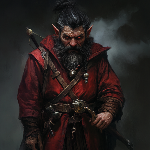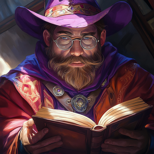 Dungeons and Dragons, Fantasy, Male Dwarf without a beard, wearing a wizard hat, the dwarf is sharp eyed and contemplates a tome through dainty silver glasses. He has a visible jaw set onto a wide face. Dressed in vibrant robes reds and purples, looks similar to varric from dragon age inquisition, anime style