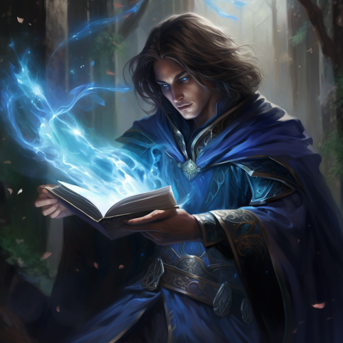 D&D fantasy artwork, male elven wizard, blue magic, brown hair, focused, spells
