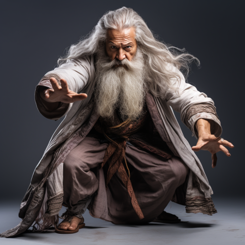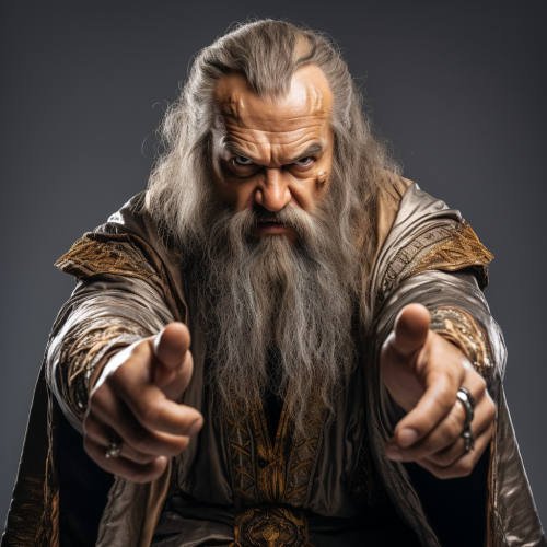 studio photo of a futuristic male wizard with a beard looking straight into camera with determination and anger, intricate, gold robe, eastern style influence, asian details, maximalism, dynamic pose, action, plain white background, studio lighting ::1 Background ::-0.5 --style raw --v 5.2 --s 250