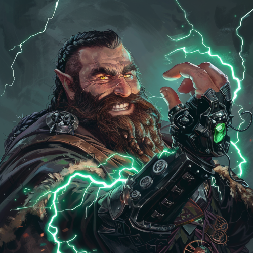 A magic the gathering style high detail digital painting of a dungeons and dragons style Dwarf male with a braided beard, he is posed wearing a short wizard like robe and a magical black colored metal gauntlet glove with lightning and electricity produced from a green gem imbedded in it, He is posed holding the gauntlet up and pulling it onto his hand and smiling at it and its power, evil sorcerer --v 6.0