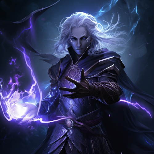 : (highly detailed) (sharp focus) (masterpiece) male drow elf, wizard fantasy Noble mages robes, long straight hair, pointed elf ears, pointed ears, full body, underdark in background, in 2D anime style, black and grey and purple and cobalt theme, dynamic lighting, magic lightning all around. octane render