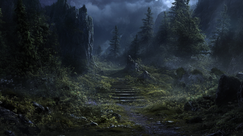 dark forest, huge trees, canopy, whimsical, highly detailed, photorealism, dnd, forgotten realms, fey, witcher