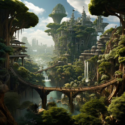 In the forest, houses standing on tall trees, grass, sunny weather, sunlight filtering through the trees, angle to look up, photorealistic --ar 16:9