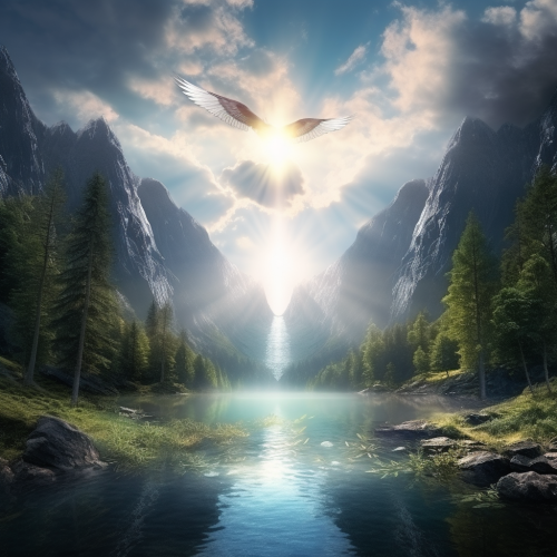 please create me an ultra realistic photo of a beautiful breathtaking scenery with an angelic touch to it