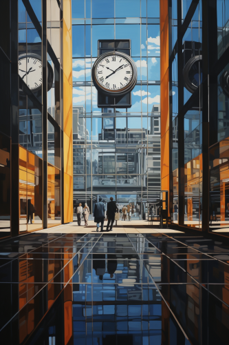 "Reflections of Time": Paint a historic building reflecting in the glass facade of a modern skyscraper, symbolizing the passage of time, urban dreamscape, acrylic painting --seed 1694351104 --ar 2:3