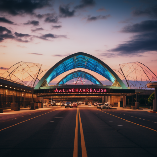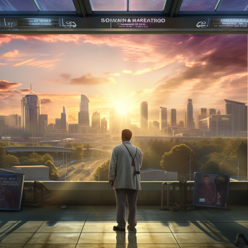 the city of Atlanta, looking towards the airport arrivals section, a doctor with a carry on, looking at the sun, sun rays are shining on him, letters in the sky spell out welcome to your journey in English.