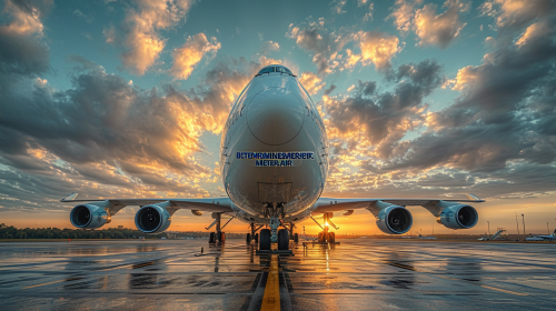 Imagine an engaging image that A white Boeing 747 apron, a cleaning lady logo on the bow , word "BETER MINE AIR" written on The plane , summer, atlanta, hdr, color grading, real photo , Super resolution, ultra detailed, detailed face, wtihe european, Photorealistic, commercial photography, Sony A7R --ar 16:9 --s 750 --v 6.0 --style raw
