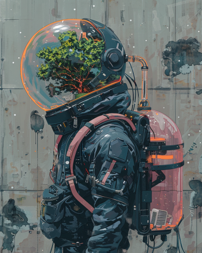 a figure wearing a high tech helmet,standing with the back at the viewer carrying glass backpack with a tree inside with an oxygen pipe connected to the helmet, in the style of intricate cyberpunk worlds, dark navy and pink, cartoon-realistic still life, aetherclockpunk, atmospheric light, chemical reactions, sticker --ar 4:5 --stylize 250