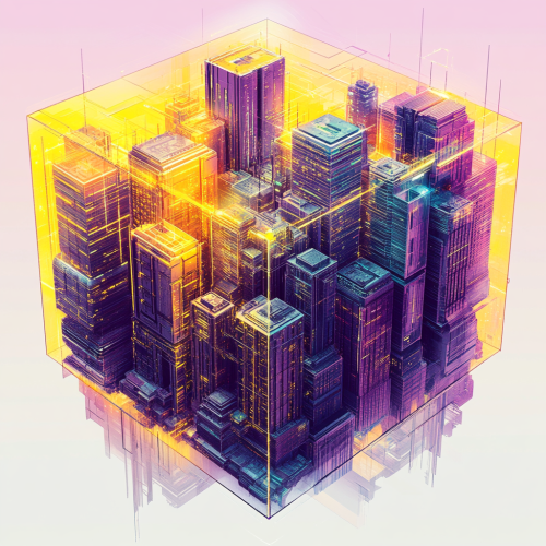 Create an ultra-realistic futuristic cluster of buildings with symmetrical structures, all enclosed within a transparent cube that features a gradient from yellow to purple. The buildings should have sleek, modern designs and intricate details, emphasizing the harmony of shapes and symmetry --v 6.1