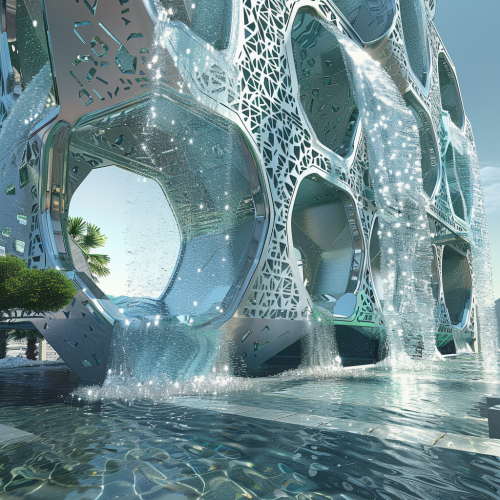 contemporary sustainable building of a water cube architecture , the water cube is falling water in all cube faces , advanced futurisitic style --v 6.0