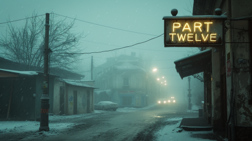 Cityscape in the style of atmospheric and moody lighting, Sign has an arrow and reads "PART TWELVE" russia,movie still, realist detail, light maroon and dark aquamarine, intense gaze, ue5, post-war 35 mm photo, in the snow, mist, vanishing point --ar 16:9 --stylize 150 --v 6.0