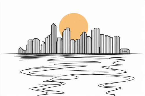 A simple line drawing of a river flowing in front of a sky skyline with the sun behind the skyline. Cute illustration, white background, minimalistic design, line art. Vector graphics. --ar 3:2 --v 6.1