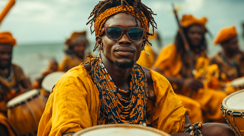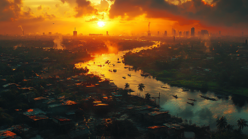 cinematic. Create The vibrant landscapes of Nigeria, with the Lagos skyline. Evening lighting. Niger Delta’s rivers and mangroves and stone terraces in the distance. warm and lively colors. energetic atmosphere. --s 500 --ar 16:9