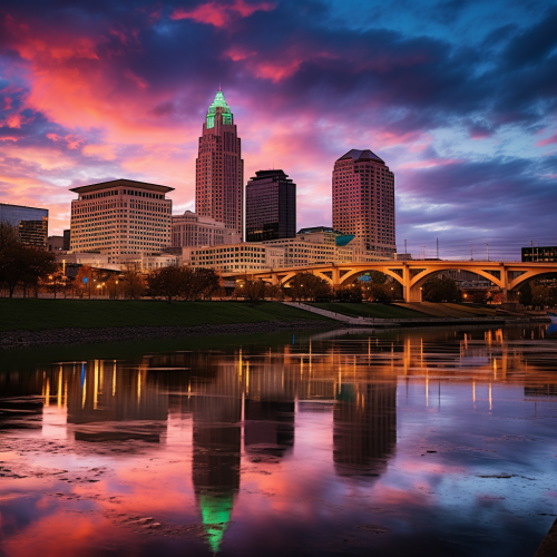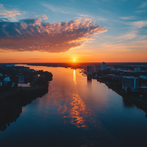 Drone shot, sunset, Wilmington skyline, Cape Fear River, city view, professional shot, 8k, high quality, warm colors, aerial, Instagram photo style, vibrant, inviting