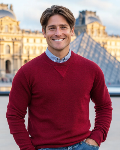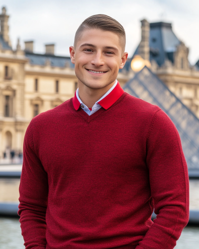 a 35-year-old brunette man with a clean cut, smiling at the camera, the louvre museum in the background, wearing a red sweater with polo underneath, denim pants --no beard --ar 4:5