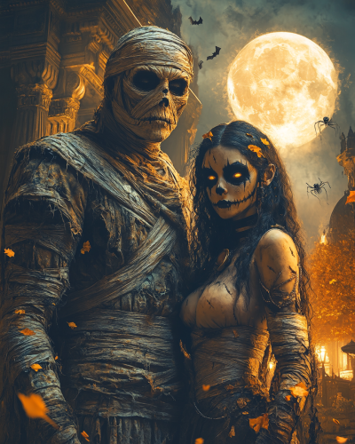 Create hyper realistic spooky Egyptian king as a mummy and Cleopatra as a mummy together in front of a Victorian museum during Halloween night. Pumpkins and spooky trees. Full moon. Fall leaves and spiders and bats. --ar 4:5 --v 6.1 --stylize 500