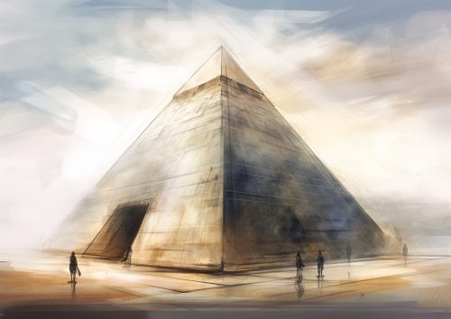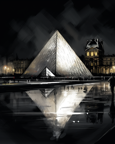 Expressionist-style charcoal sketch of the Louvre Pyramid. Night scene, using dramatic light contrasts and reflective water surfaces. --ar 4:5