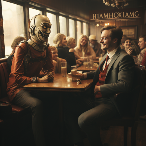 Two pharmacists dispensing medicine--one is a happy, efficient robot pharmacist, while the other is a stressed-out and unhappy human pharmacist. The patient being helped by the robot is also happy, while the patient being helped by the human pharmacist is angry.