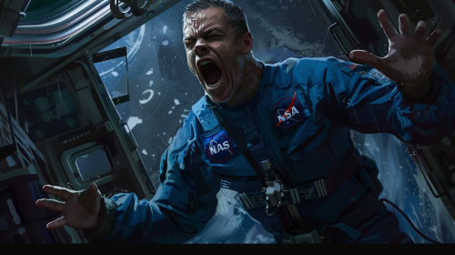 a digital painting, Matt Damon, on a space station with no windows, wearing a blue NASA jumpsuit, yelling at somenoe, dark colors, contemplative atmosphere --v 6.0 --ar 16:9 --style raw