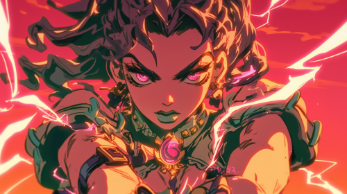 Raiden Shogun,Genshin Impact, female,Jo's Bizarre Adventure art style, intense illustration of Raiden Shogun from Genshin Impact, reimagined in the iconic JoJo's Bizarre Adventure art style. Raiden Shogun strikes a fierce and electrifying pose, with exaggerated muscles, sharp angles, and intense shading. Her traditional samurai-inspired attire is reinterpreted with JoJo's bold fashion elements, including intricate armor details, flowing fabric, and powerful accessories. dynamic patterns, capturing the essence of her electro abilities, all in a vibrant and striking color palette. --ar 16:9 --niji 6