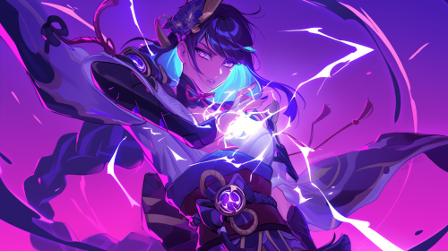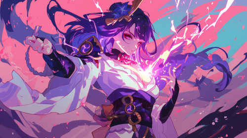 Raiden Shogun,Genshin Impact, female, intense illustration of Raiden Shogun from Genshin Impact, Raiden Shogun strikes a fierce and electrifying pose, with exaggerated muscles, sharp angles, and intense shading. Her traditional samurai-inspired attire is reinterpreted with bold fashion elements, including intricate armor details, flowing fabric, and powerful accessories. dynamic patterns, capturing the essence of her electro abilities, all in a vibrant and striking color palette. --niji 6 --ar 16:9