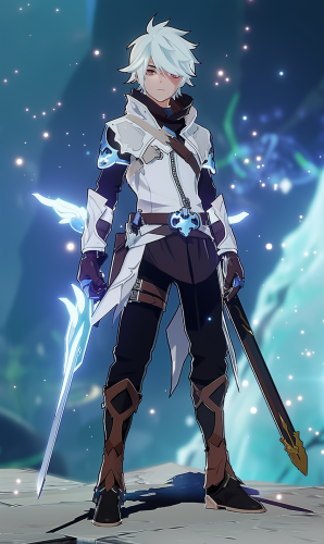 character design video game dark knight star fantastic Genshin Impact style white hair black eyes young man and Sword like Galaxy --ar 3:5
