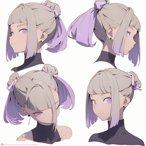 variety of hairstyle design, short hair with purple fringes, model sheet, anime style genshin impact --niji 5 --style expressive